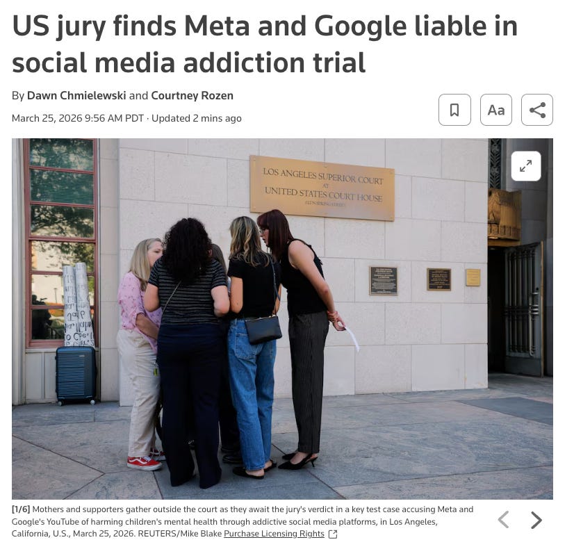 A Los Angeles jury just found Meta and YouTube liable for designing addictive platforms that harmed a young woman’s mental health — $3 million in compensatory damages, with punitive damages to come.