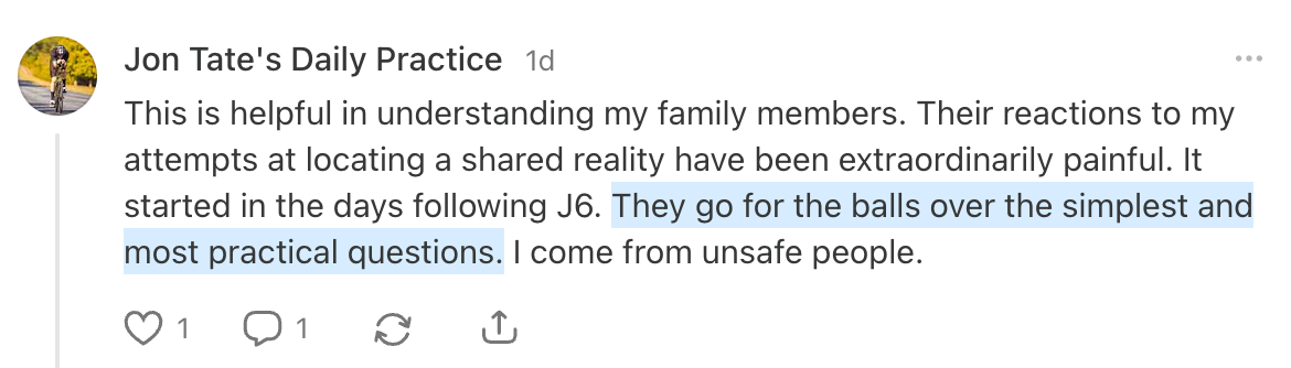 As I posted on TikTok last week (and got a lot of fascinating feedback), it’s been hard to find a one-sentence definition of what it is. But a history teacher posting there described it fundamentally as a worldview, not a political ideology. He calls it “an allergy to abstract thought,” in which one’s concrete certainty about reality must be protected against any challenge, no matter how gentle or thoughtful, and regardless of whether that challenge leads to better outcomes. It blew my mind, and resonated with a lot of people. Here’s how one commenter on Substack put it in regards to his own family: