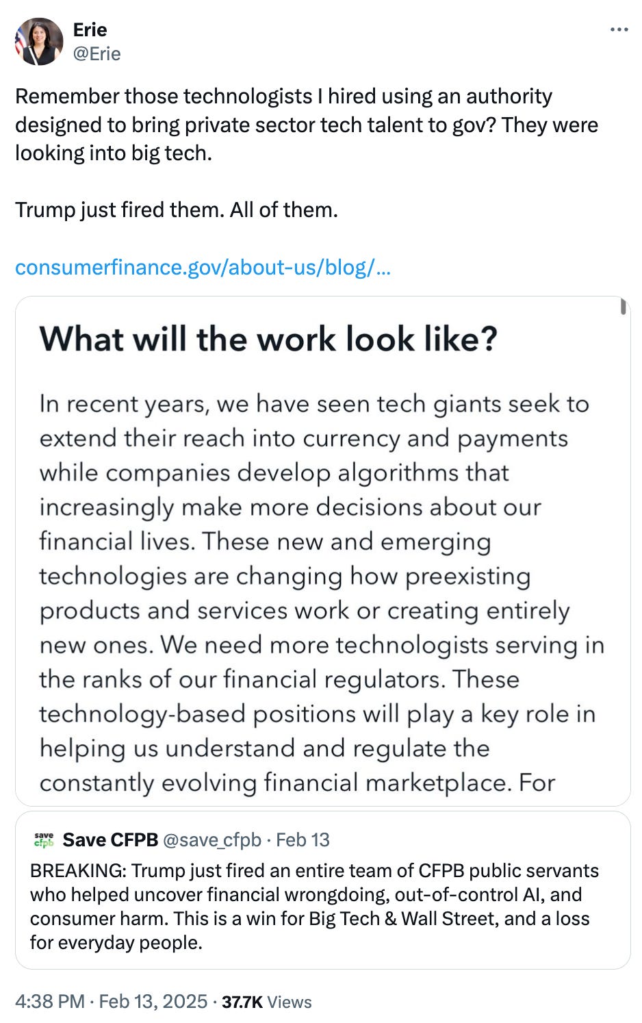 The 100 people fired from CFPB on Thursday, before a federal judge halted more dismissals, included the 20 or so technologists like Hand who were the backbone of its research and investigative powers. They reported to Erie Meyer, the bureau’s Chief Technologist, who described the dismissals this way on X: