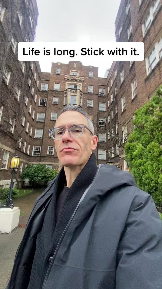 For me the lesson of this period was that my darkness is perfectly useful, but it can’t drive the car all the time, because it eventually steers me into a tree. So I have to take the wheel in a conscious, often uncomfortable way, and I do so by preparing, with the help of friends, therapists, and occasional antidepressants, for my inevitable battles with what Andrew Solomon called The Noonday Demon. And more and more I’m learning to speak about it in the Future Authentic. These days it’s going pretty well. For one thing, having seen the cycle repeat itself so many times, I’m able to see that life is long, and that what I see when I’m in the grip of depression is most certainly not all there is. I try to share this notion as often as I can, and when I speak in the Future Authentic it seems to find an audience. I was moved to post something about this to TikTok when I found myself in front of an apartment building that was the scene of fierce depression back when I lived in Seattle, and more than 700,000 people watched. I still get comments on it, years later.